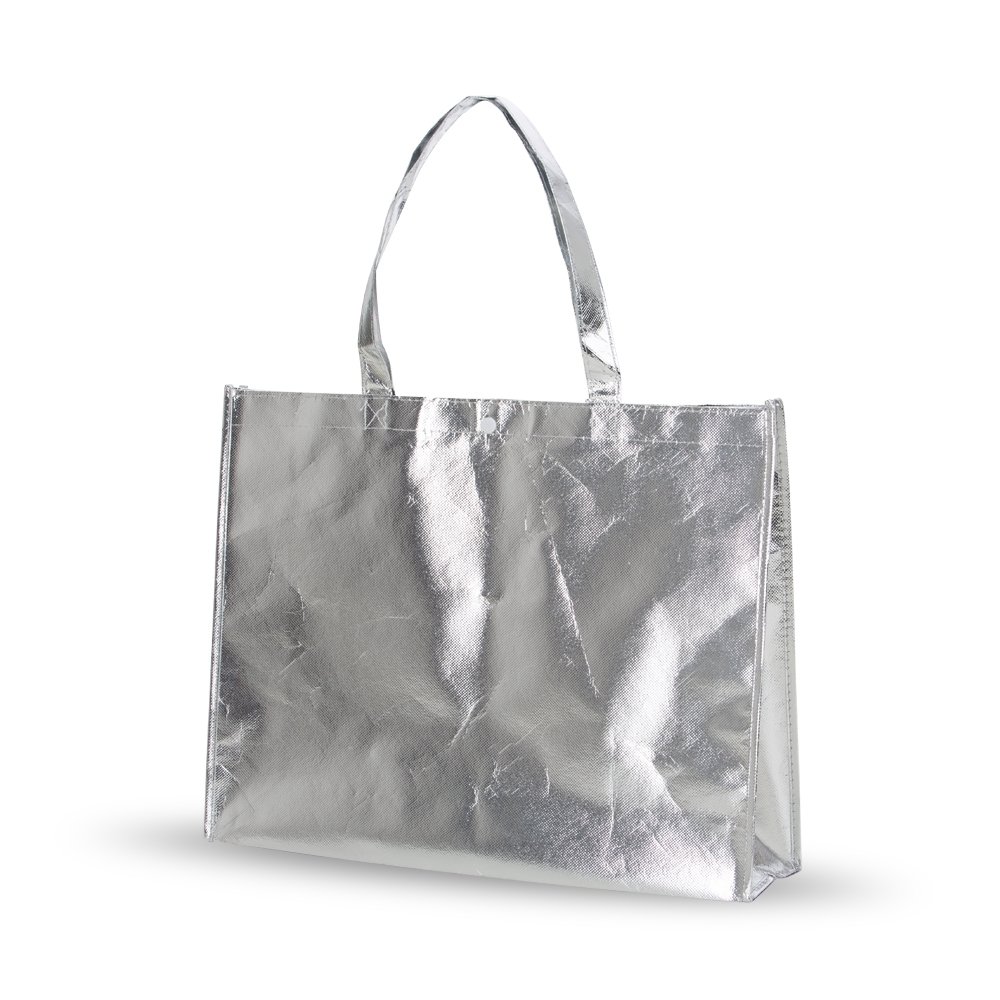 Sacola TNT metalizada 110g/m² com botão. Confeccionado em TNT com revestimento plástico laminado, parte superior possui botão plástico para fecho.