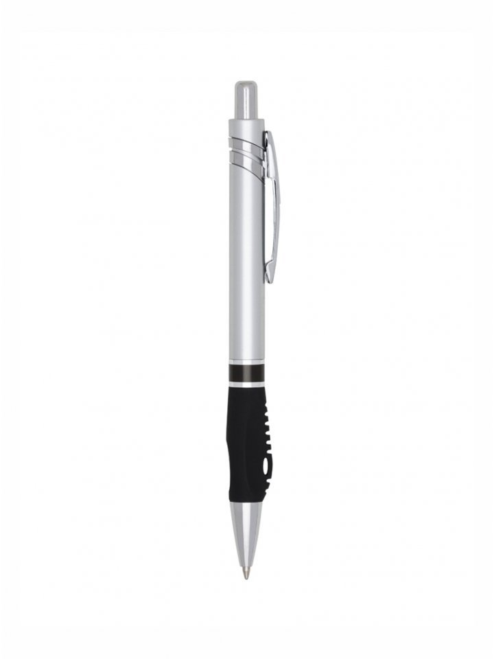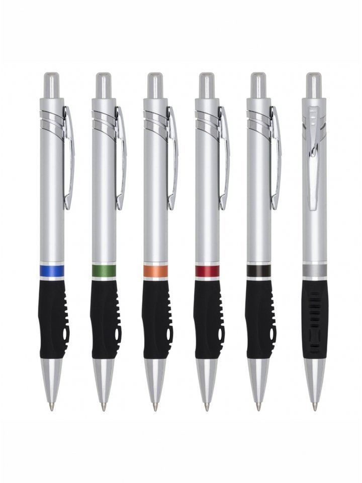 Caneta plástica inteira prata com detalhes em colorido. Clip de metal, possui anel colorido e parte inferior emborrachada com relevo. Aciona por clique.