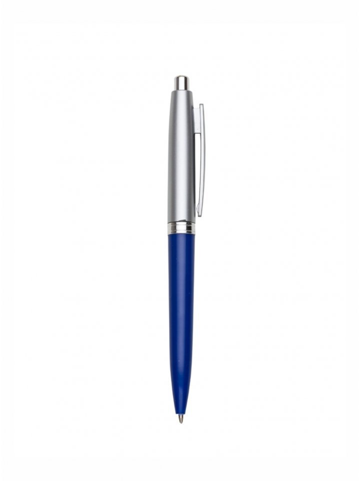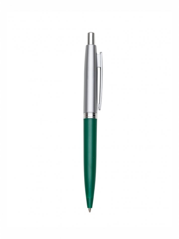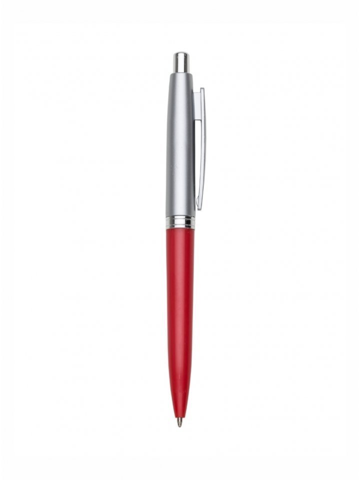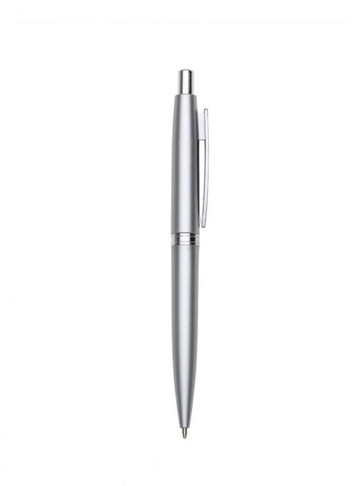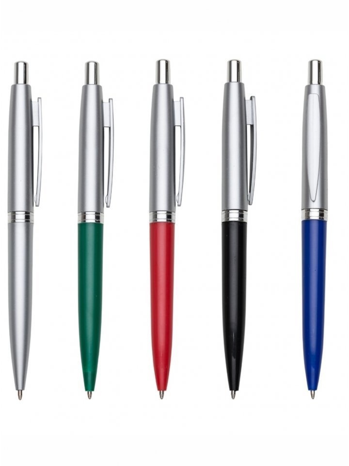 Caneta plástica prata com detalhe colorido. Clip plástico, possui anel central com detalhes em relevo. Aciona por clique.