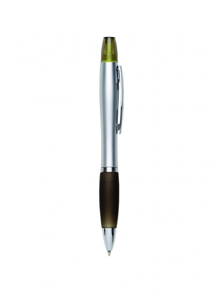 Caneta plástica com marca texto, corpo prata com anel inferior e detalhe emborrachado colorido. Clip metálico com detalhe vazado no centro, possui tampa plástica para o marca texto. Aciona por giro.