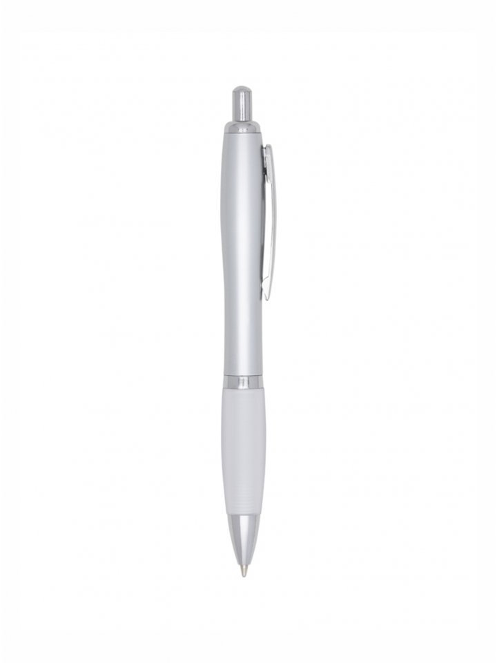 Caneta plástica prata com anel e detalhe emborrachado colorido. Clip de metal, aciona por clique.