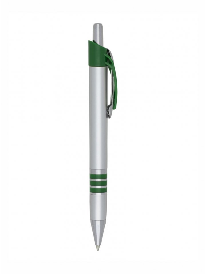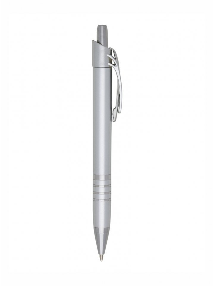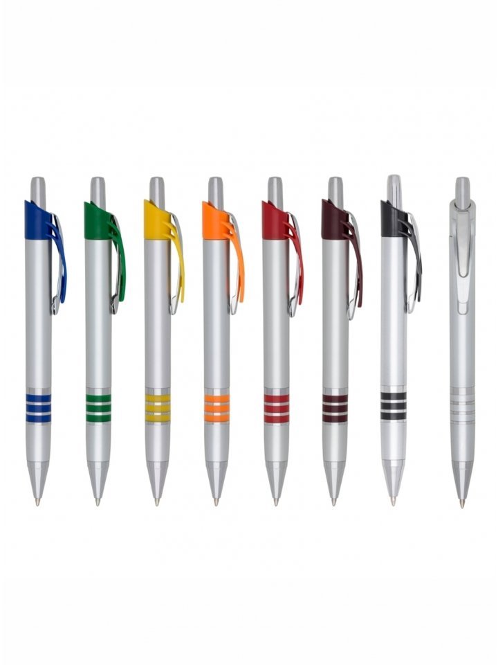 Caneta plástica inteira prata com detalhes coloridos. Possui clip de metal com detalhe plástico colorido, parte inferior com três anéis coloridos. Aciona por clique.