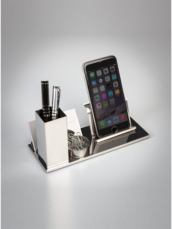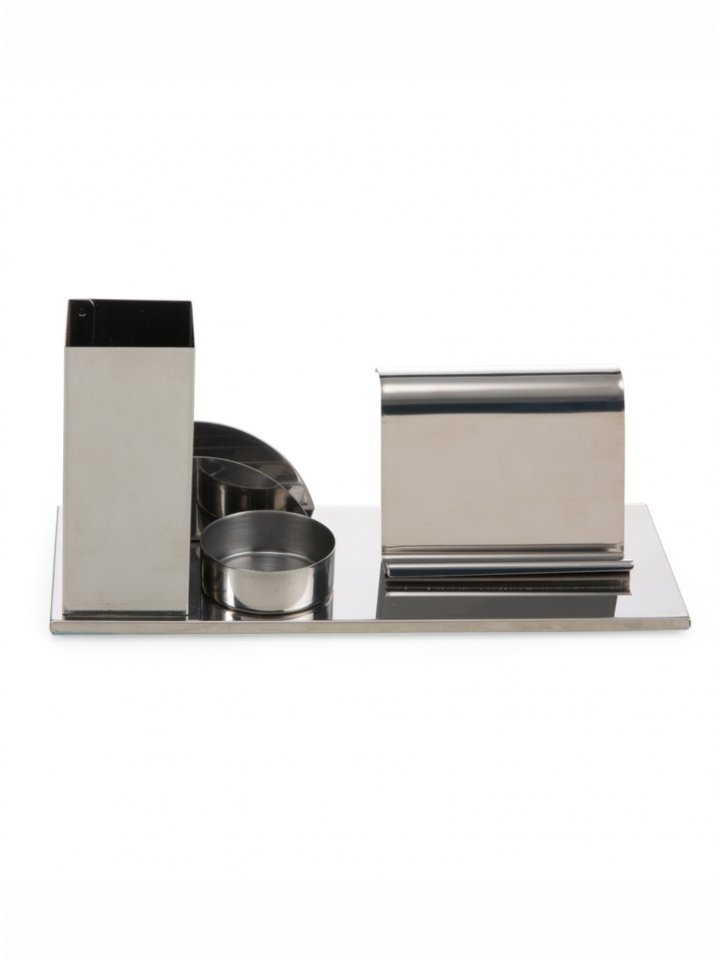 Kit escritório 4 em 1 em inox espelhado. Possui suporte para canetas, cartões, clips e celular.